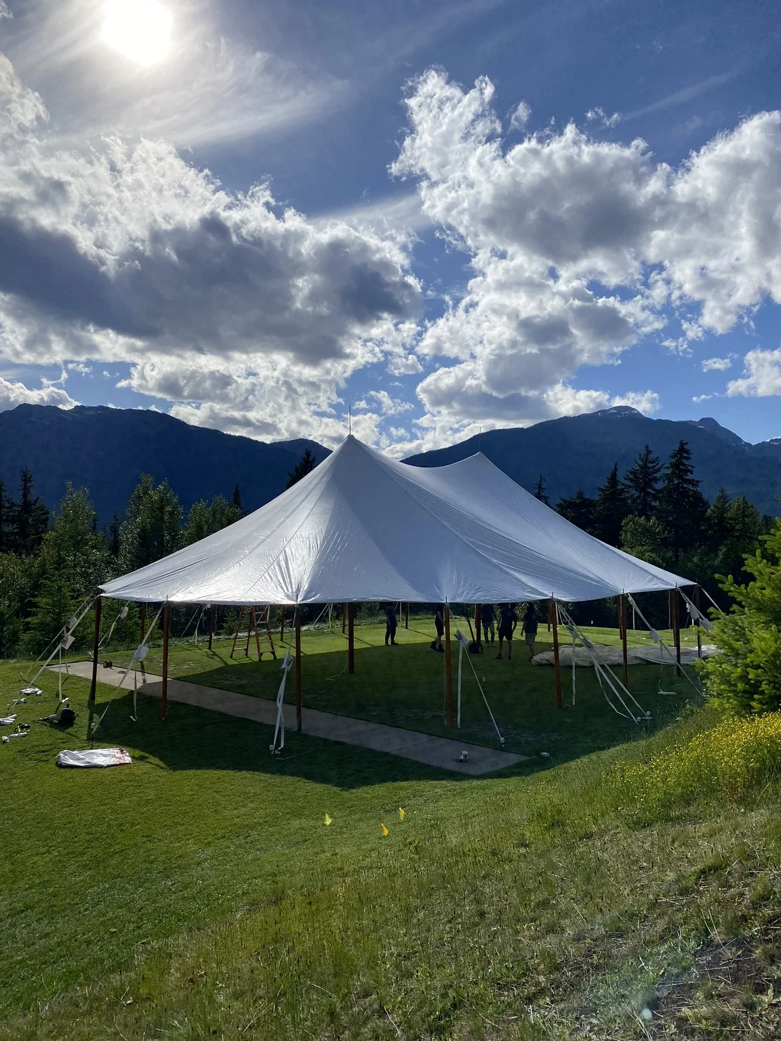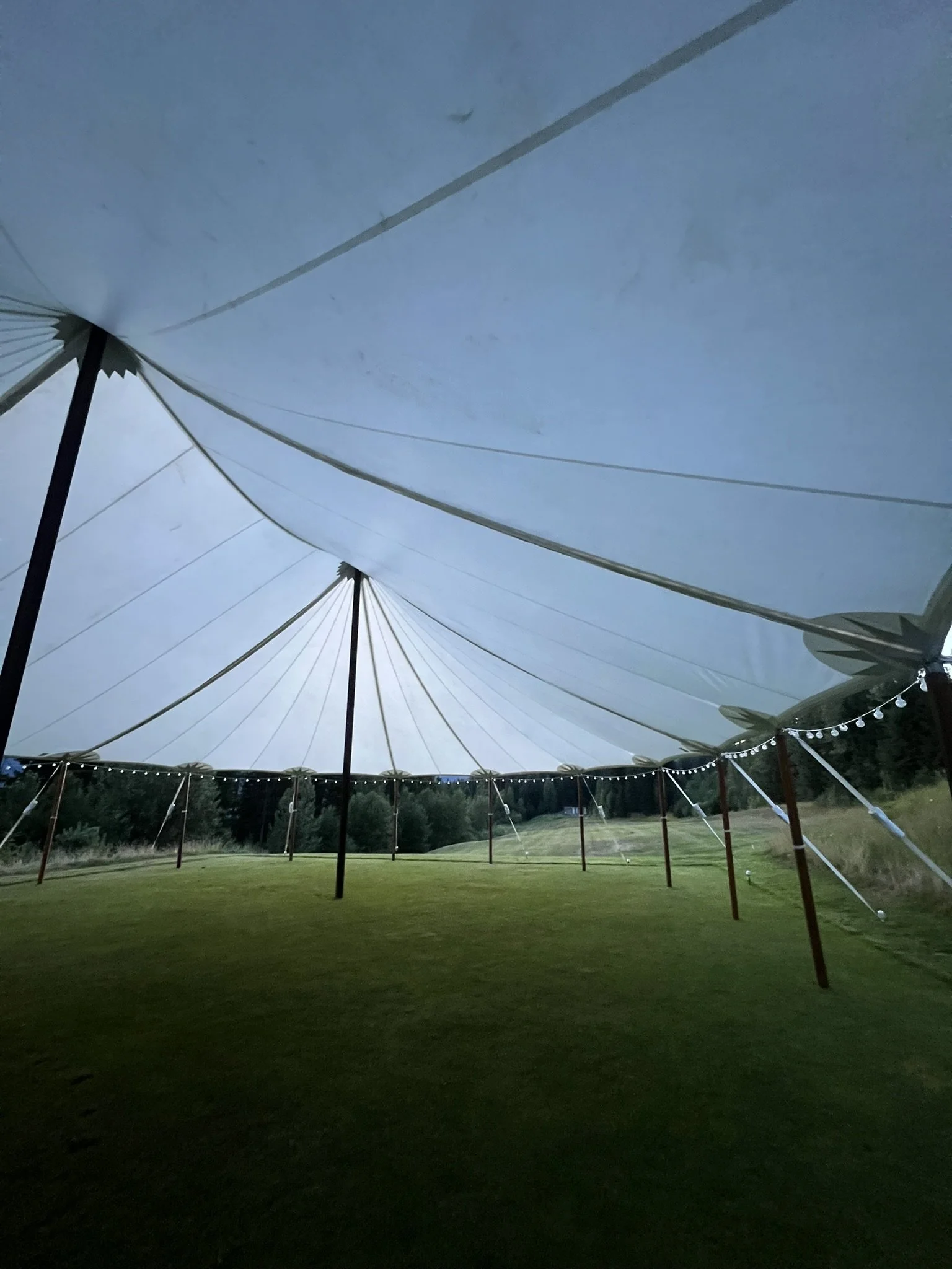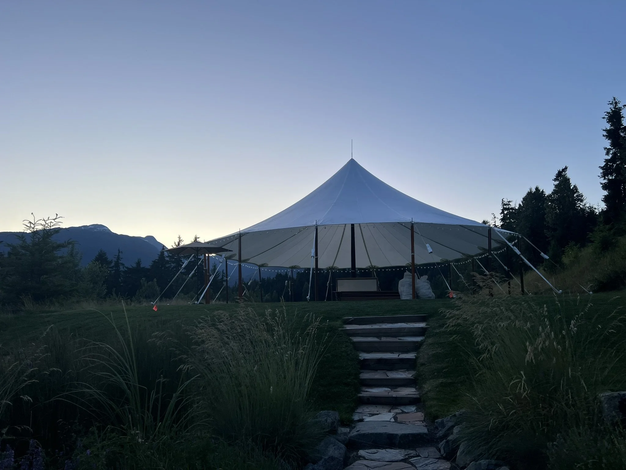 Luxury sailcloth wedding tent rental with translucent fabric and wooden poles, ideal for elegant outdoor weddings, coastal events, and upscale celebrations.